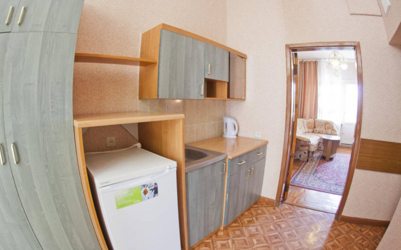 туалет, умывальник, ванная или душ, кондиционер, двуспальная кровать, диван, 2 тумбочки, 2 стула, шкаф, телевизор, холодильник.
