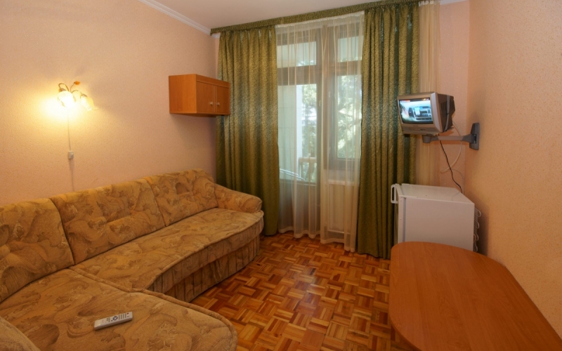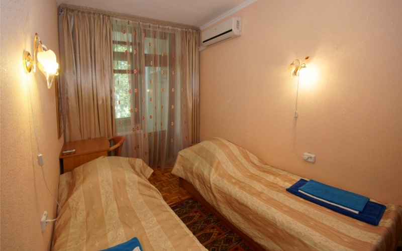 В номере: туалет, умывальник, душ, кондиционер, 2 односпальные кровати, диванчик, 2 тумбочки, 2 стула, шкаф, телевизор, холодильник.