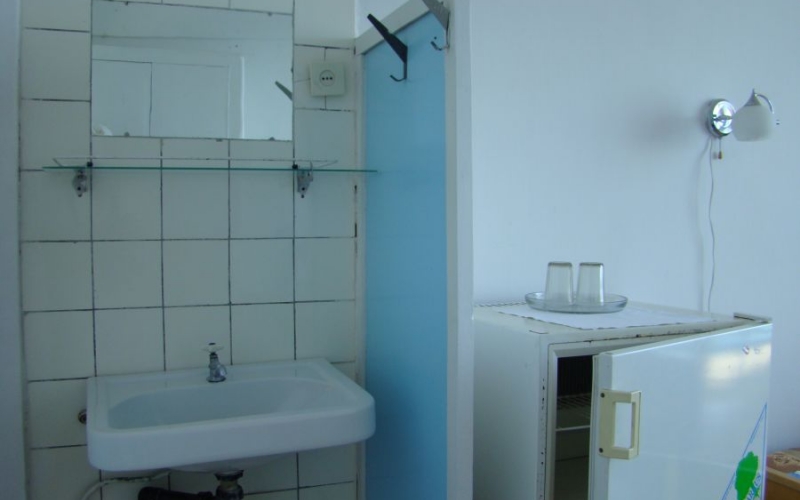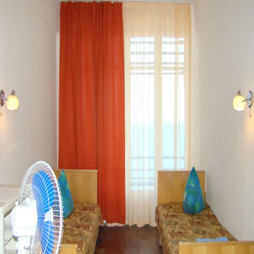 В номере: 2 односпальные кровати, 2 тумбочки, 2 стула, шкаф, холодильник, вентилятор.