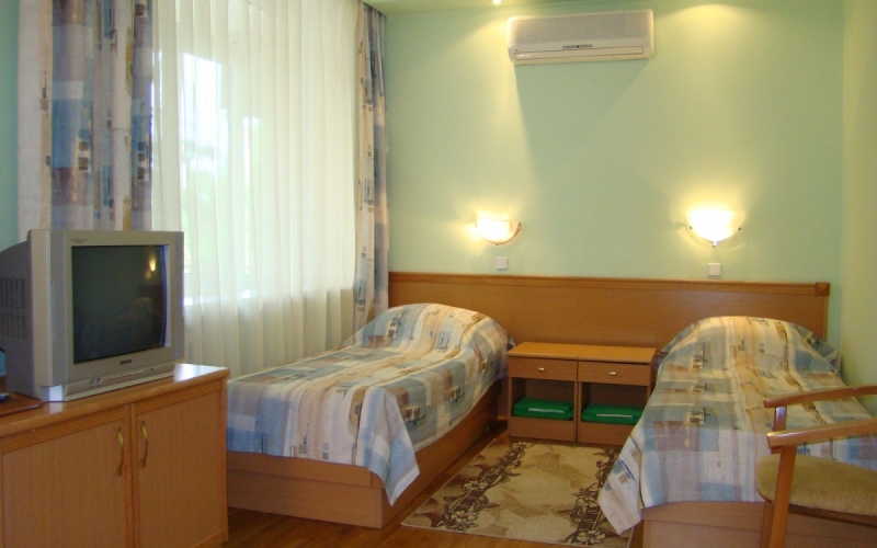 В номере: туалет, умывальник, ванная или душ, кондиционер, 2 кровати, 2 тумбочки, 2 стула, шкаф, телевизор, холодильник.