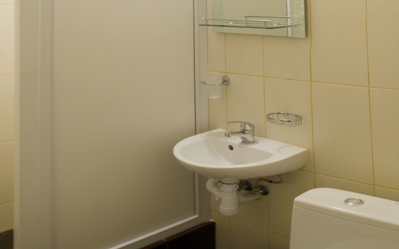 В номере: коридор, туалет, умывальник, душ, кондиционер, 1 кровать, 1 тумбочка, 1 стул, шкаф, телевизор, холодильник. Пол — ковролин.
